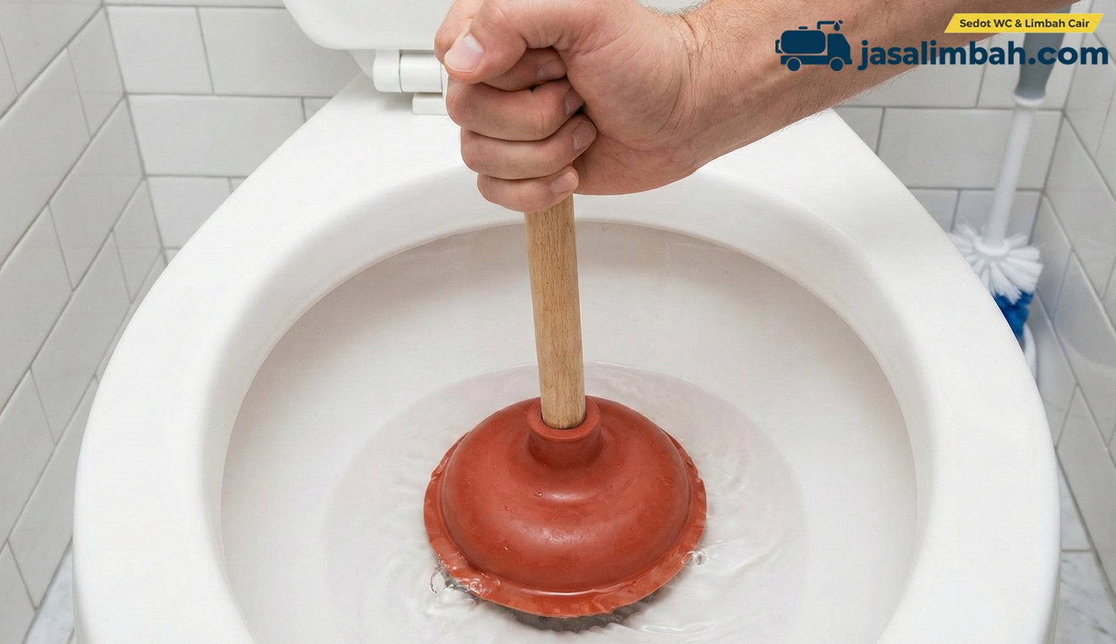 Pastikan Anda menggunakan plunger yang memiliki bibir tambahan (khusus toilet). Pastikan seluruh bagian bawah plunger terendam air agar tercipta daya hisap yang maksimal. Lakukan gerakan memompa dengan kuat namun berirama untuk mendorong sumbatan lumpur di dalam pipa.